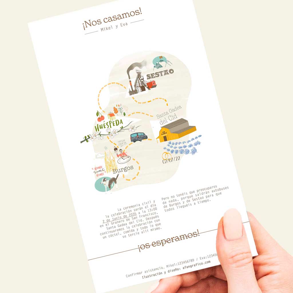 Dinos qué quieres que aparezca en tu invitación. Crearemos un diseño como de postal en un precioso sobre transparente.