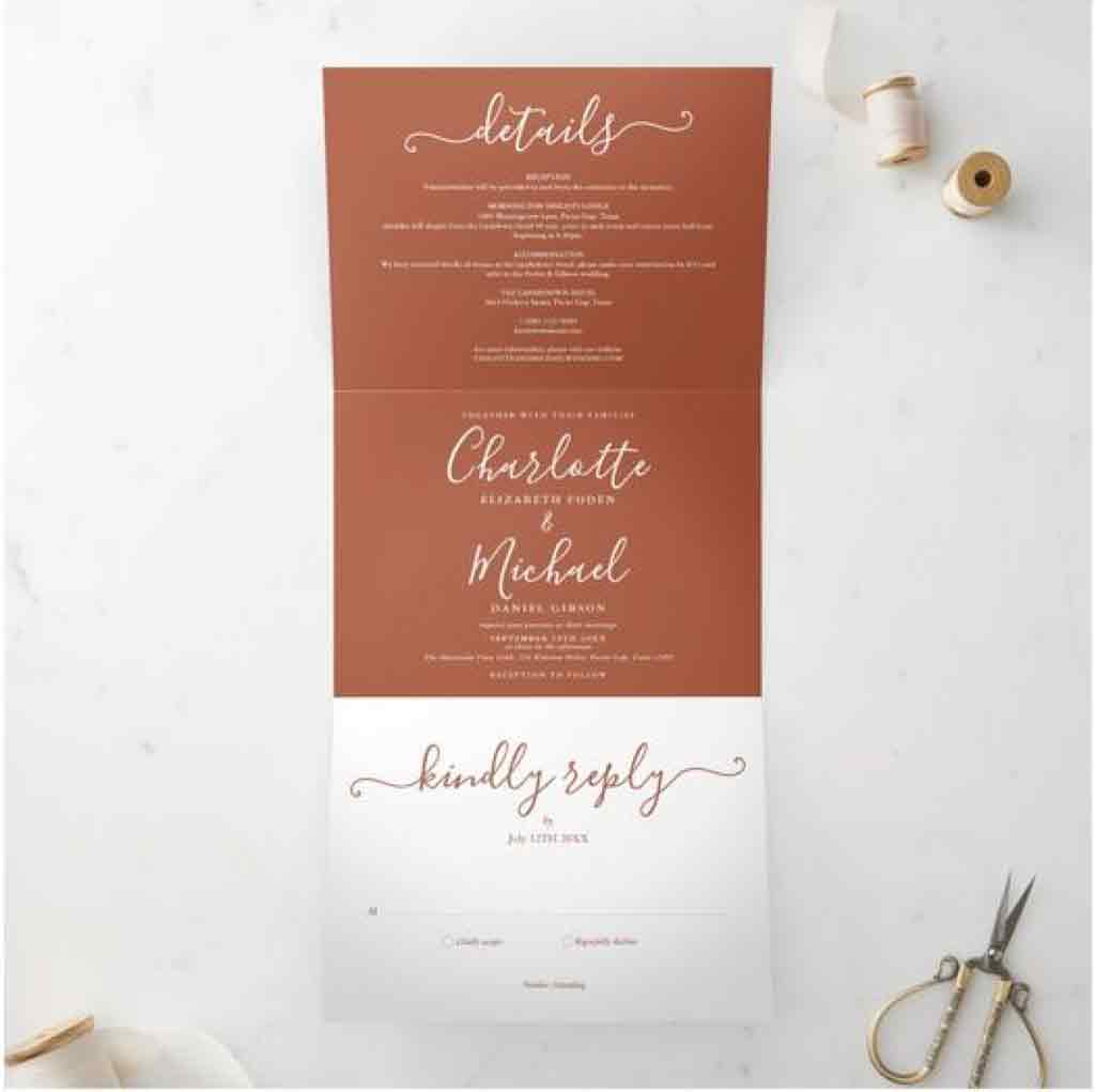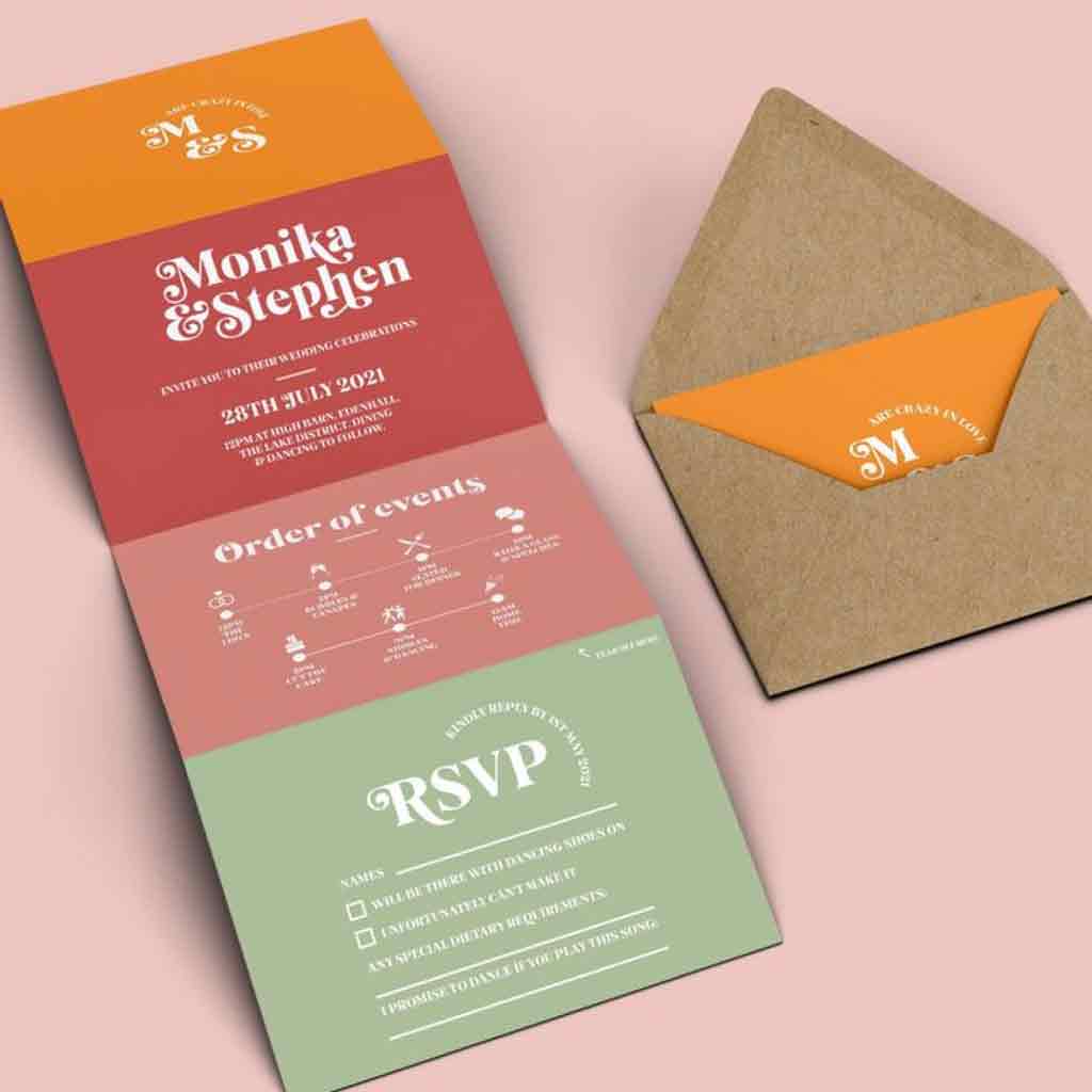 Un desplegable con tres gamas de color en las que aparecen todos los detalles de la boda: nombres de los novios y fecha en grande, menú.... Ideal si necesitas incluir mucha información.